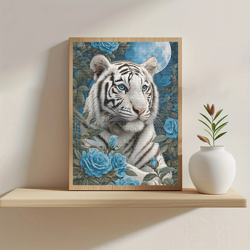1pc, 13.8x17.7in, White Tiger & Blue Roses Cross Stitch Kit - DIY Eco-Line Art, 11CT Embroidery Fabric, Includes Threads, Needle, and Instructions - Perfect for Home Wall Decor, Mother'S Day Gift, Unframed, Mother'S Day Gift|