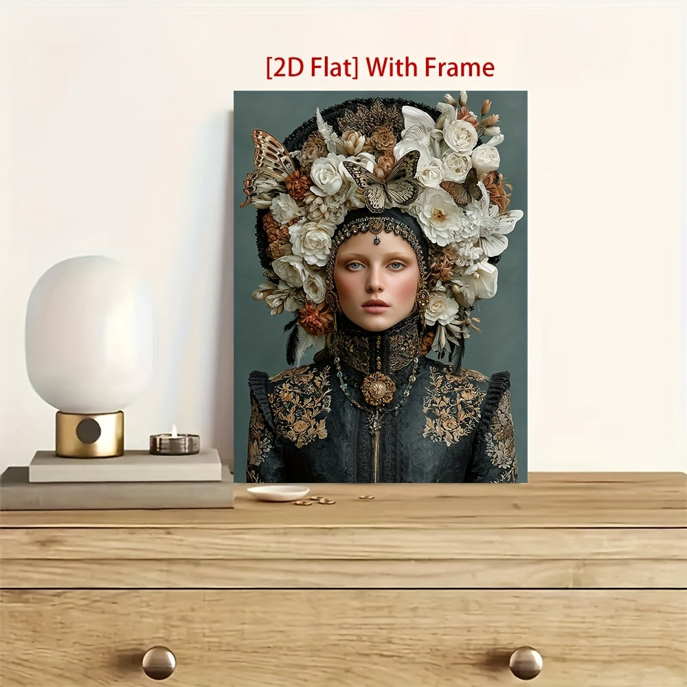 1pc Framed Lady in Butterfly Hat Wall Art - 12x16 Inch Modern Gothic Woman Painting with Floral & Jewel Portrait, Surreal Boho Decor, Frame & Wrapped Canvas Print for, Bedroom, Office - Victorian-Inspired, 2D Flat, Cross Stit