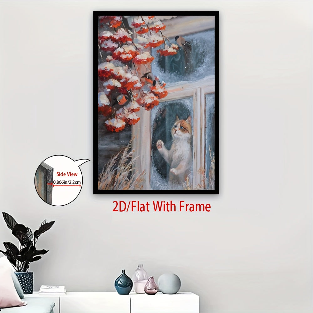 2D Flat, Framed Cat & Birds Winter Window Scene Canvas - Modern Classic Vertical Wall Art with White Kitten & Red Berries, Cozy Snowy Home Décor for Living Room, 2D Flat, Christmas Cross Stitch Kits, Christmas Wall Art, Chri