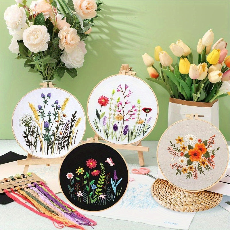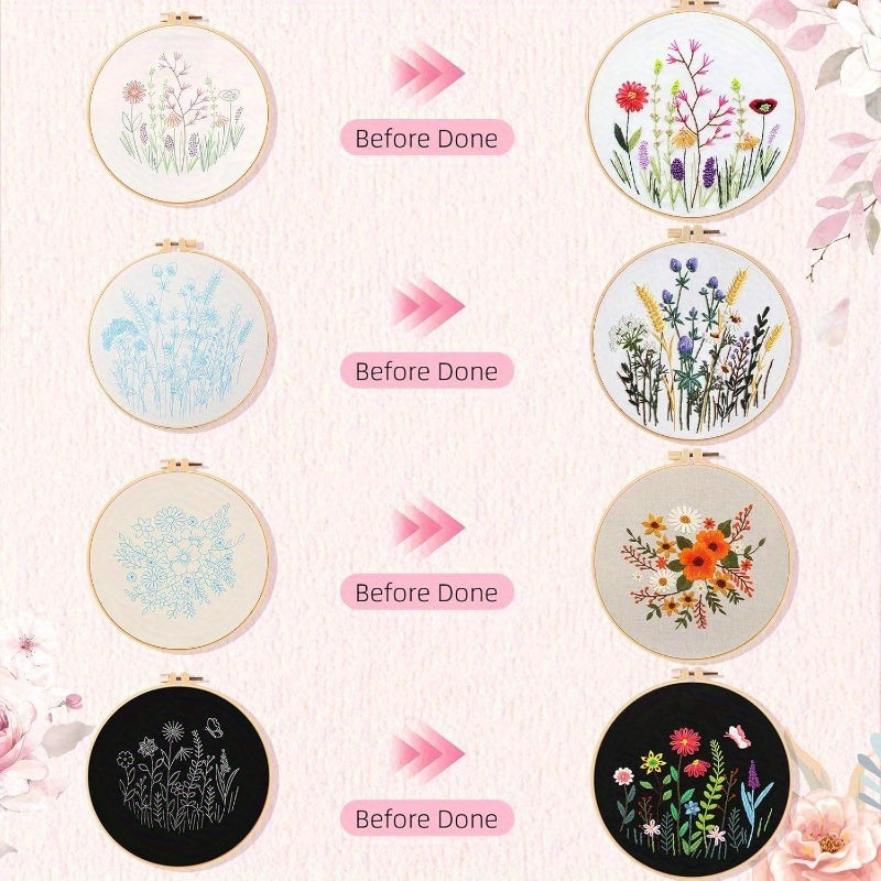 4 Pack Flower Embroidery Kit Adults, Floral Pattern Embroidery Kit Beginners Practice Kits with Hoop, Threads, Scissors, Threader, Needle Insert, Thimble, and Needles Sewing, Stamped Cross Stitch Kits, Cute Flowers and Plants