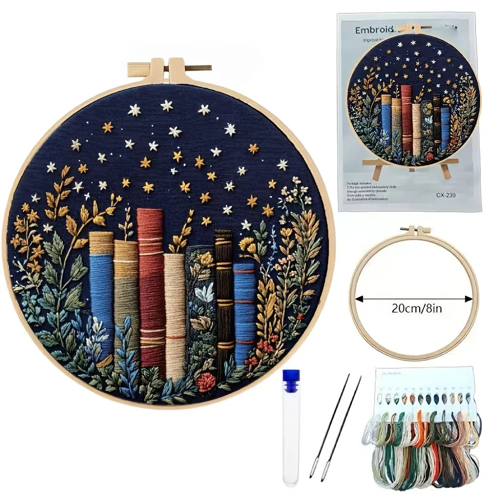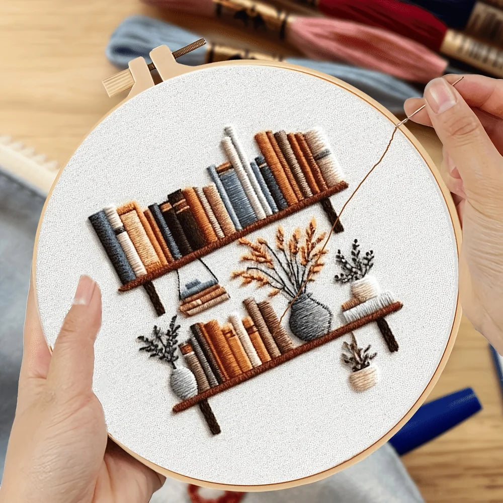 Creative Bookshelf Flower And Plant Book Pattern Series Handmade DIY Embroidery Material Package Set. The Embroidery Set Include