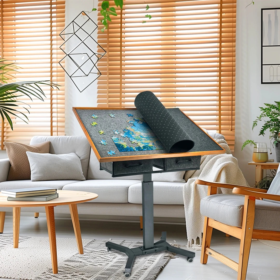 Freestanding Jigsaw Puzzle Table w/ Drawers, Adjustable 1500pcs Board, 360° Rotating Wheels, Portable Workstation