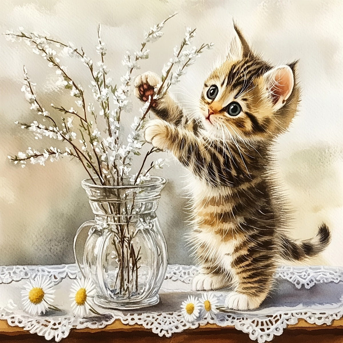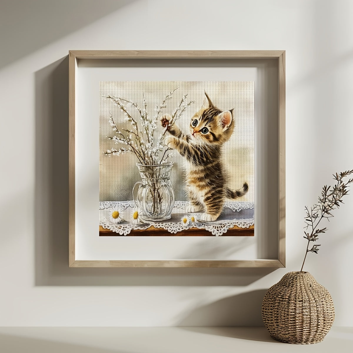 JOZYSH DIY Cross Stitch Kit - 11x11 Inch/30x30cm - Playful Kitten with Flower Vase Design, Fabric Embroidery Pattern for Home Decor, Includes Printed Image, Embroidery Fabric, Threads, Needle & Instructions, Ideal Christmas G