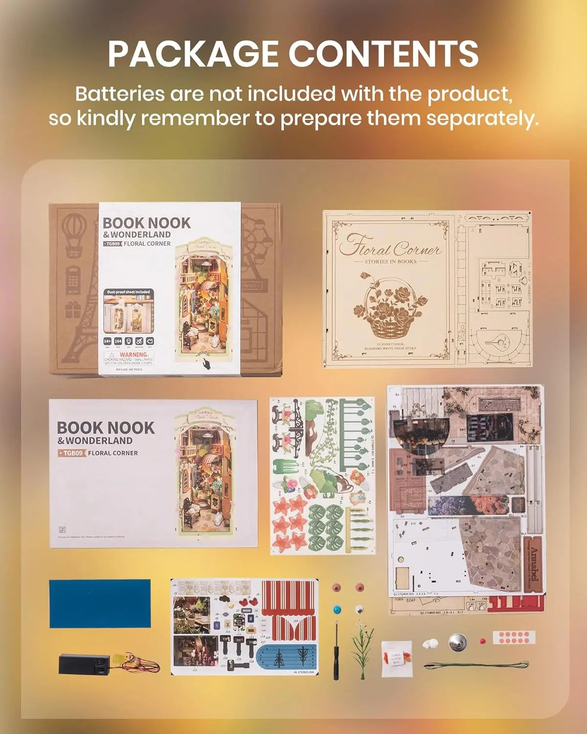 Robotime Floral Corner Book Nook Kits with LED Lights Miniature 3D Wooden Puzzle Bookend Book Shelf Decoration Gifts for Adults