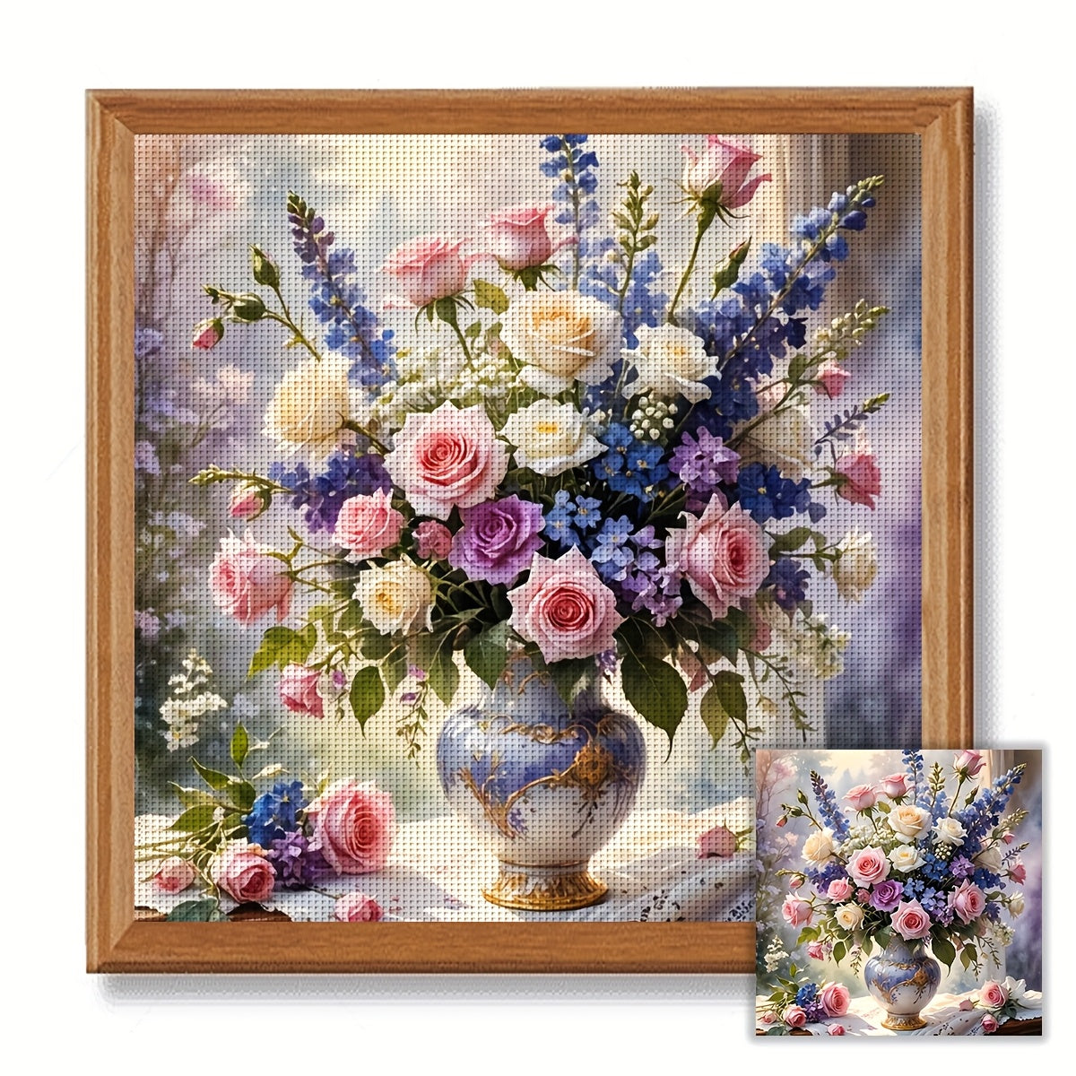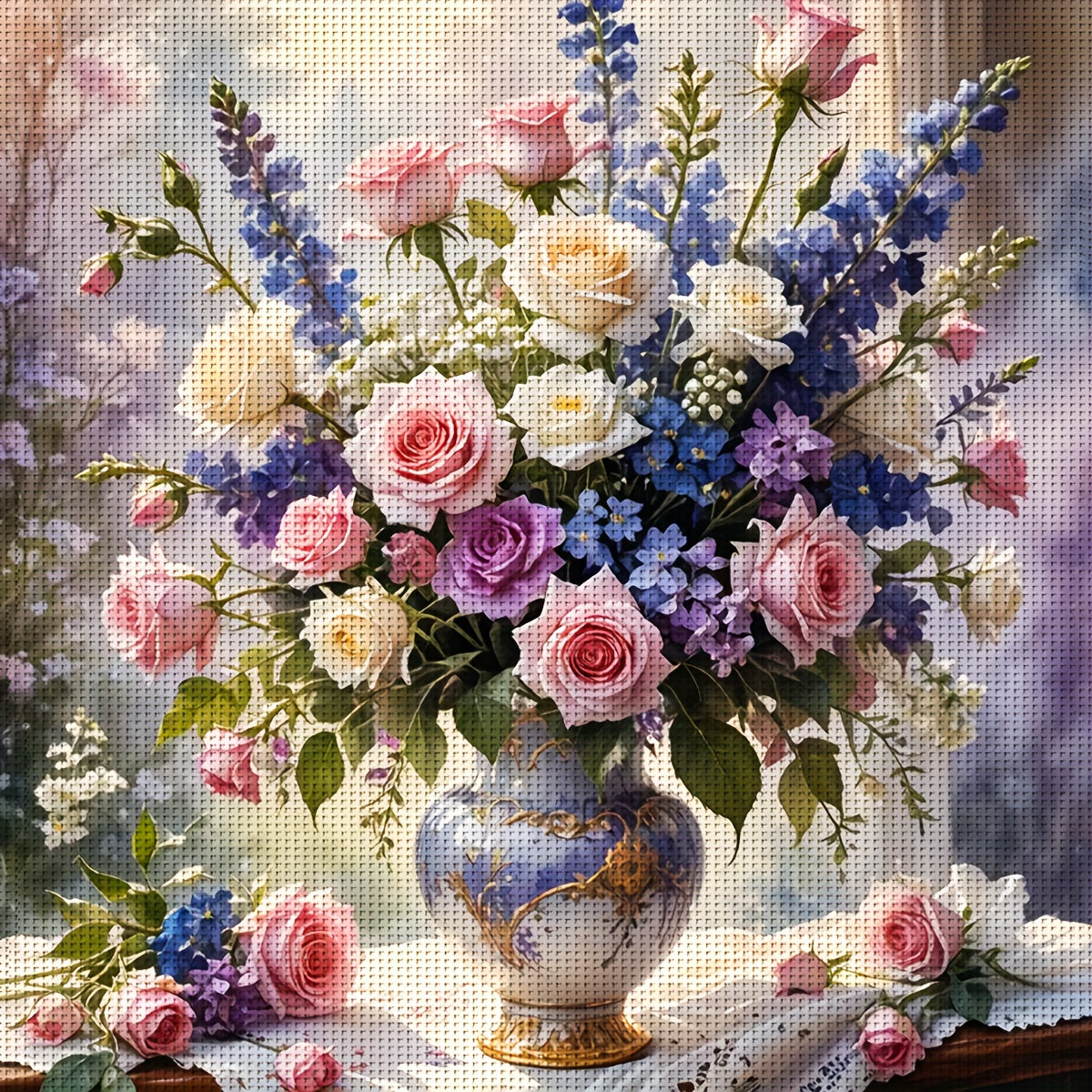 ZUOANLF 19.69x19.69inch DIY Cross Stitch Flower Bouquet Kit - Beautiful Roses and Wildflowers in Blue Vase, Unframed Fabric Art for Home Decor, Includes Pattern Fabric and Threads, Perfect for Living Room, Entryway, or Bedroo